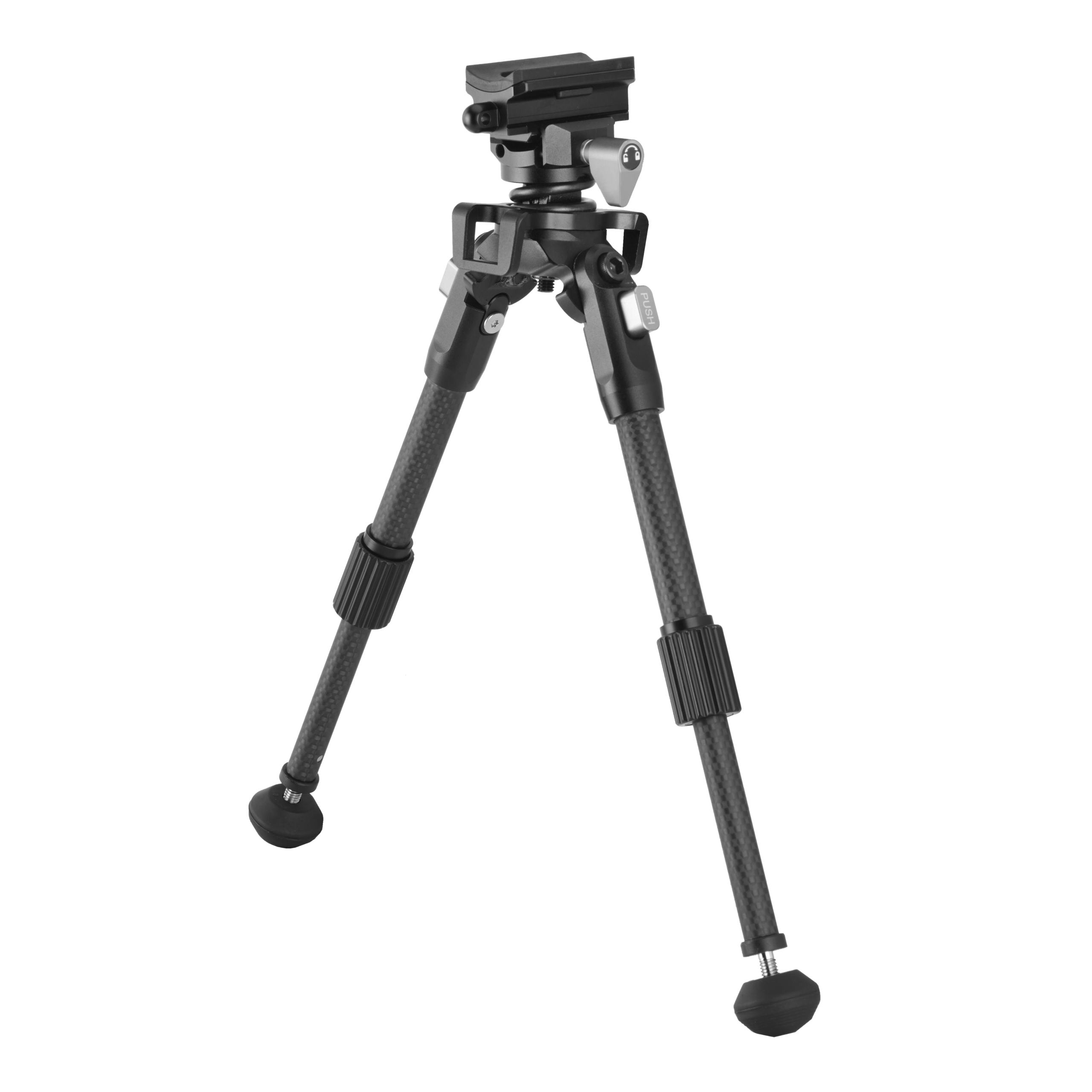 Med ±35° rotasjon og ±10° tilt justerer du enkelt skytestillingen, mens en kraftig spiralfjær reduserer vibrasjoner og gir stabilitet. Beina foldes parallelt med rifla – både fremover og bakover – og låses lydløst ut med trykknapp. Høyden justeres mellom 20 og 26,5 cm med vrilås på hvert bein. Metallføtter med pigger kan byttes til gummi for godt grep på alle underlag.
